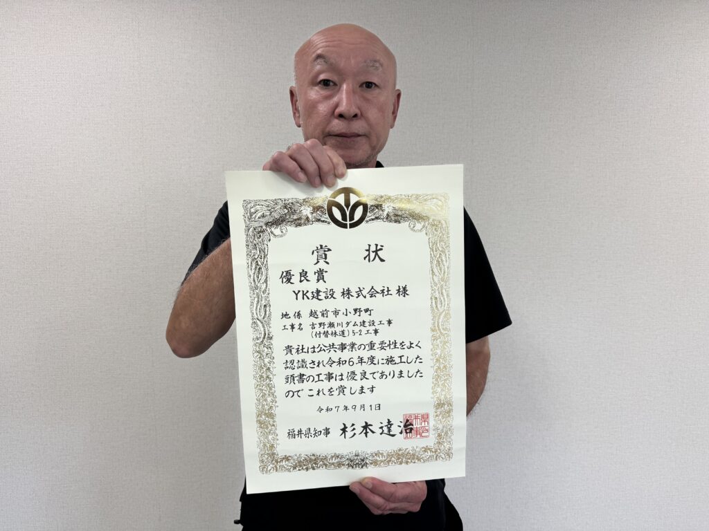 2025年9月1日 福井県令和7年度の優良工事等事業者に選ばれ、福井県杉本知事より表彰を受けました。